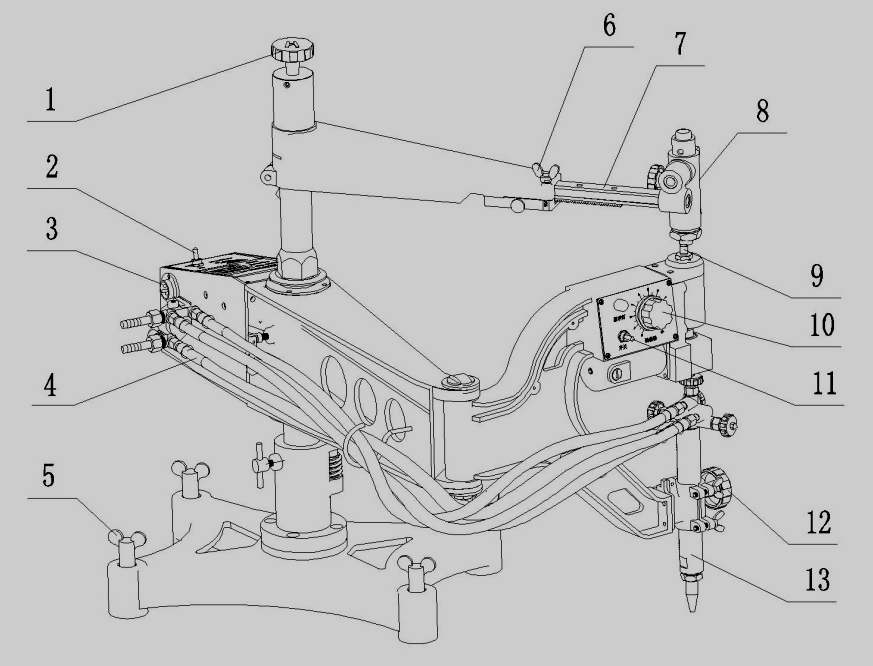 1.形臂升降手輪:松開形臂栓緊螺絲,調節該手輪可使形臂總成總升總降。 |