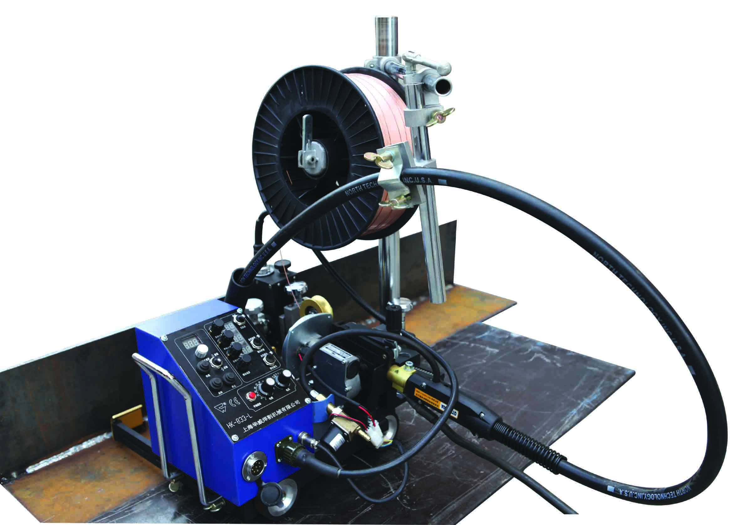 標準型CG2-600割圓機,其標配有一把割炬。“CG2-600”型半自動割圓機采用鋁合金鑄造而成,輕巧便攜。機械兩檔變速,調速系統采用可控硅觸角調速,運行速度平穩。機身底腳裝有滾輪,移動方便。本裝置通過其底座上三個支撐點放置在被切割鋼板上。電機通過減速箱變速,帶動中心軸作旋轉運動進行切割,割圓半徑根據需要可調節,也可在鋼板豎直和角度擺放情況下進行切割。使用該割圓機可提高工效、保證切割質量有效減輕工人的勞動強度。本機采用兩檔變速,調速系統采用可控硅觸角調速,調節精確。割炬總路設有總閥,切割同厚度的鋼板只需調整火焰一次,以后無需再調整。本裝置配有氣體旋轉分配器,膠管不纏繞。本裝置,有效減少了勞動時間,降低了工人的勞動強度,一定程度地提高了工作效率。