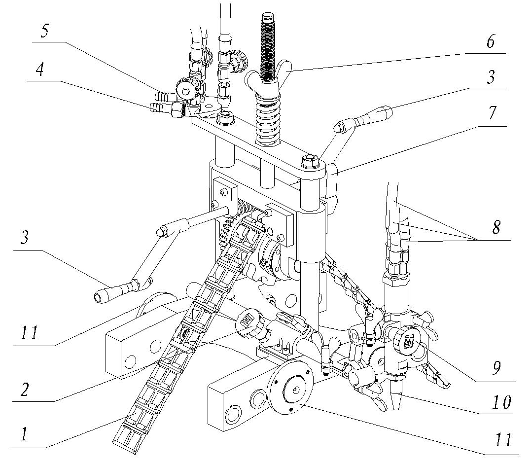 1. 鏈條:環繞鋼管鎖緊機器,隨著鏈條傳動,帶動機器繞管壁開始行走。 2.橫移手輪:轉動手輪,割炬向左或向右水平移動 3.搖動手柄:順時針方向搖動,機器則向前行走。逆時針方向搖動,機器則向后行走。 |